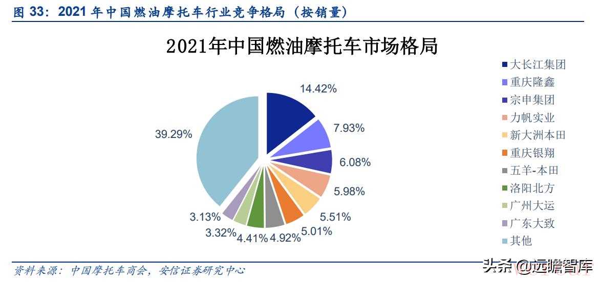 从燃油摩托车来看,目前我国燃油摩托车行业集中度适中,行业销量 CR3 为 28.43%,CR10 超过 60%。2021年,大长江集团、重庆隆鑫和宗申集团占据市场份额前三,市占率分别为 14.42%、7.93%和 6.08%。