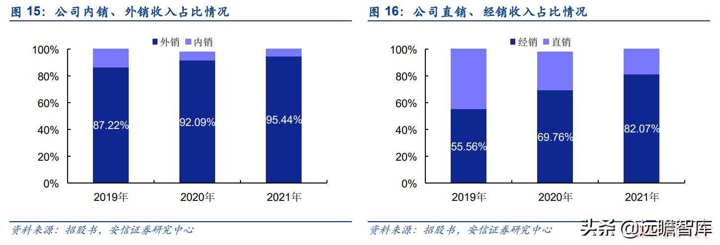 公司自有品牌销售主要采取经销模式,随着公司大力推动自主品牌销售,公司经销模式收入 占比相应大幅增加,2019-2021 年,公司经销占比由 55.56%升至 82.07%。