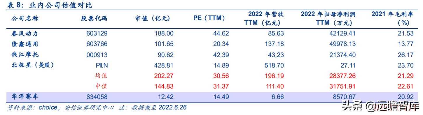 由于涛涛车业还未上市,加入摩托车行业的隆鑫通用、钱江摩托共同作为可比公司。截至最 新,可比公司市值中值达145亿元,对应的市盈率TTM中值达31X。华洋赛车停牌前市值 为12亿元,对应市盈率TTM为14X。