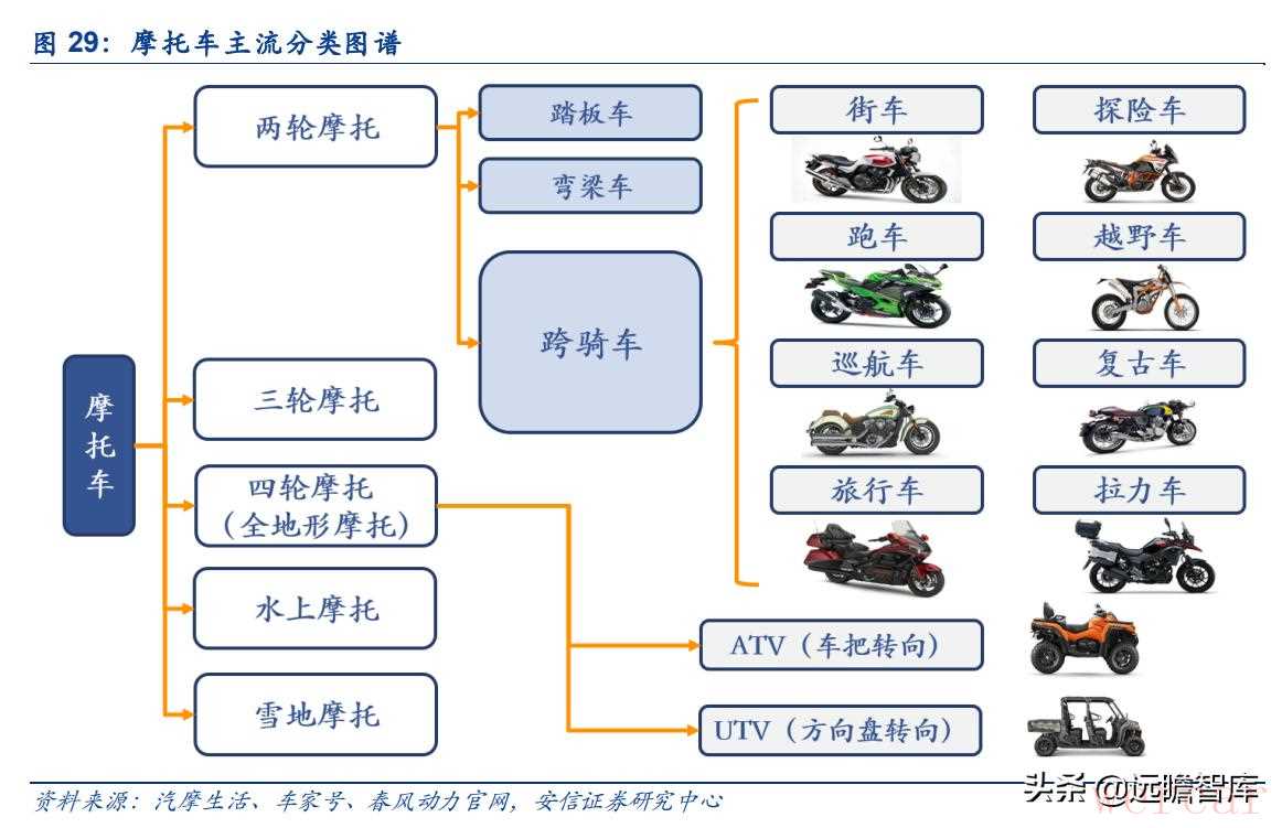摩托车可以分为两轮摩托、三轮摩托、全地形摩托、水上摩托和雪地摩托,其中两轮摩托是 目前市场上较为大众的摩托车类别,按照结构划分可以分为踏板车、弯梁车和跨汽车,而跨 汽车也可以通过用途进一步划分为街车、越野车、巡航车、拉力车等 8 种类型。