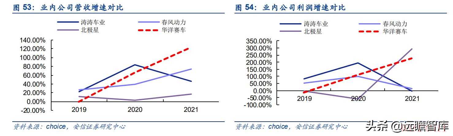 以三年期来看,华洋赛车和涛涛车业的综合成长性表现突出。值得注意的是,2021年华洋 赛车的营收及利润增速均超过100%,处于行业高位。