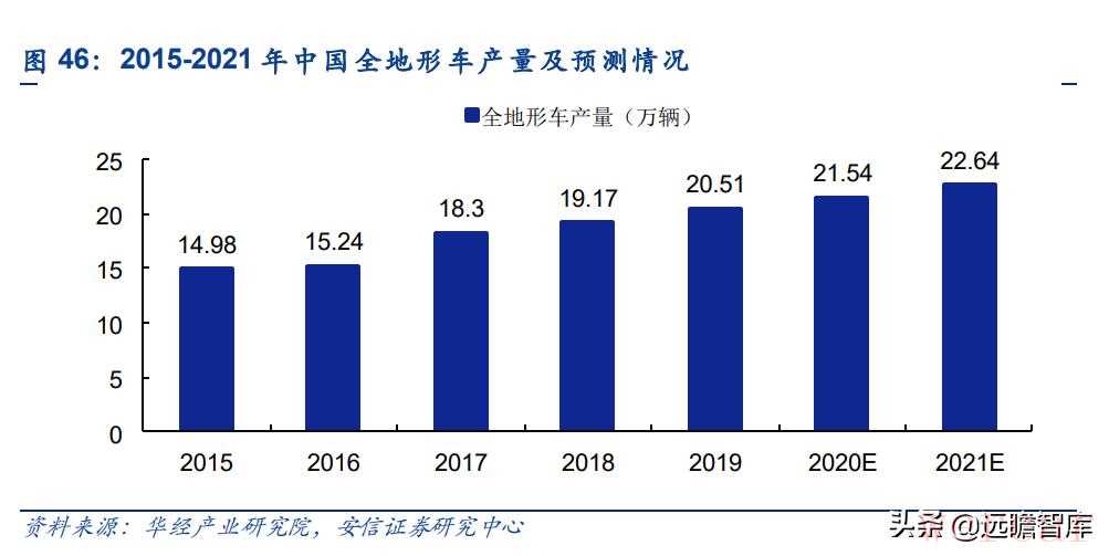 由于具有突出的优势和特点,让全地形车受到了越来越多消费者的喜爱。数据显示,我国全 地形车产量持续稳步增长,产量由2015年的 14.98 万辆增至 2019 年的 20.51 万辆。华经研究院推测,2021年我国全地形车产量约为 23 万辆。