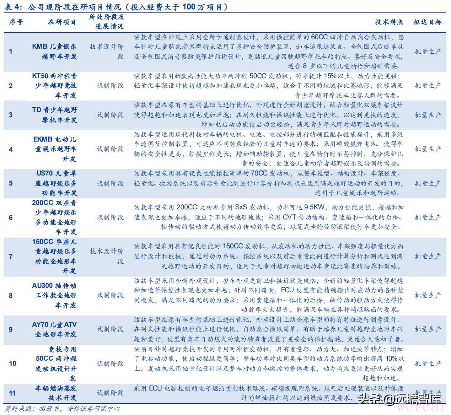 其中,运动摩托车智能制造项目的建设期预计为 36 个月,公司拟通过该项目建设,新建生 产车间,优化现有生产布局,并配套购臵相关先进设备,形成年产 40 万辆运动摩托车的生 产能力,以2021年现有两轮越野摩托车及全地形车合计产能 20 万辆为基准,扩产后合计产 能将达每年 60 万辆,为公司规模及业绩增长提供基础。(报告来源:远瞻智库)