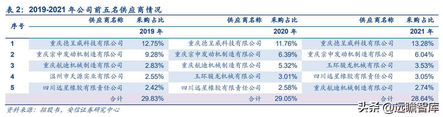 2019 年至 2021 年,公司对前五名供应商的采购金额占比均在 29%左右,其中重庆德呈威 科技有限公司和重庆宗申发动机制造有限公司两家发动机制造企业对公司的合计供货金额占比均处于 20%左右。近两年,公司前五名供货商相同,采购占比均比较稳定。