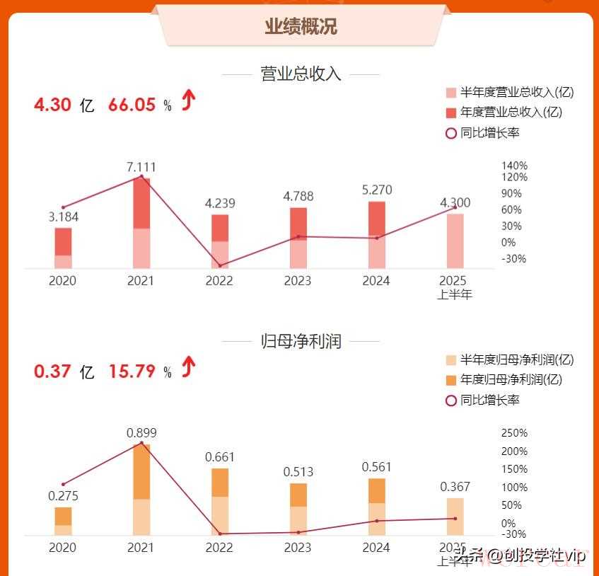 2025年上半年,公司实现营收4.30亿元,同比增长66.05%;归母净利润3673万元,同比增长15.79%。