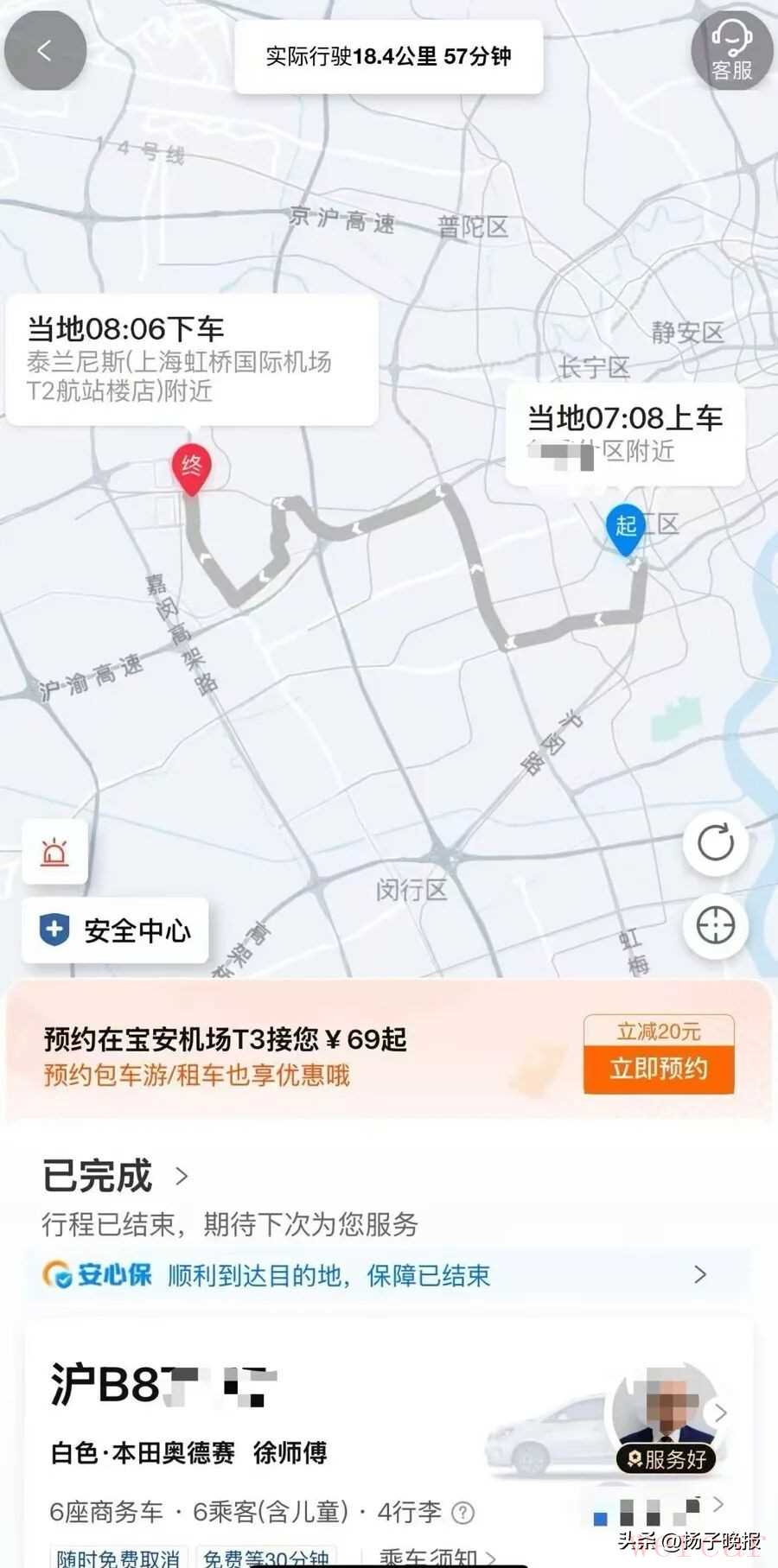 “本来是想叫个专车上一道保险,结果差点‘坑’了自己!”上海市民陆女士向“新民帮侬忙”投诉,10月20日清晨,她通过某知名旅行平台预约的送机专车司机不仅迟到、失联,还接连“上演”小马路上停车酣睡、等红灯不断瞌睡等一系列匪夷所思的操作,更是因走错路而人为增加行车时间,险些让她错过航班。约定时间不见司机司机停在路边睡觉陆女士计划当天早晨乘机出差,特意通过平台App预约了“专业送机”服务,订单要求司机7时准时到达中山西路近三汇路的小区门口,目的地为虹桥T2航站楼。清晨6时30分,她已带着厚重的行李在楼下等候,但司机迟迟未到。早晨7时5分,陆女士连续拨打两通电话,对方均无人接听。