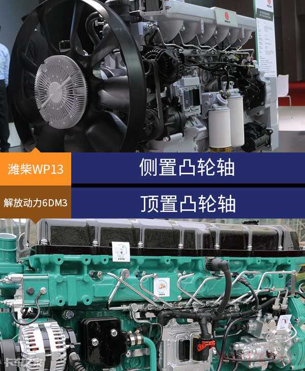 凸轮轴布局方面,潍柴WP13系列发动机采用了常规的侧置凸轮轴配气机构,技术成熟,可靠性相对也更好些。而解放动力6DM3系列发动机则采用了效率更高的顶置凸轮轴。