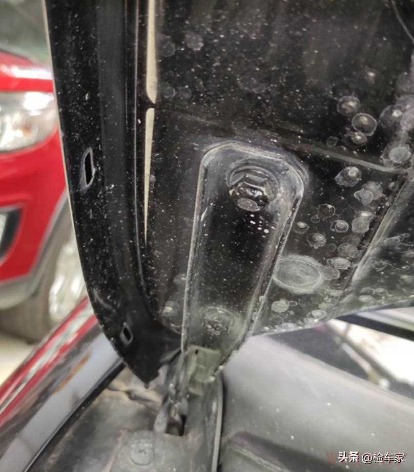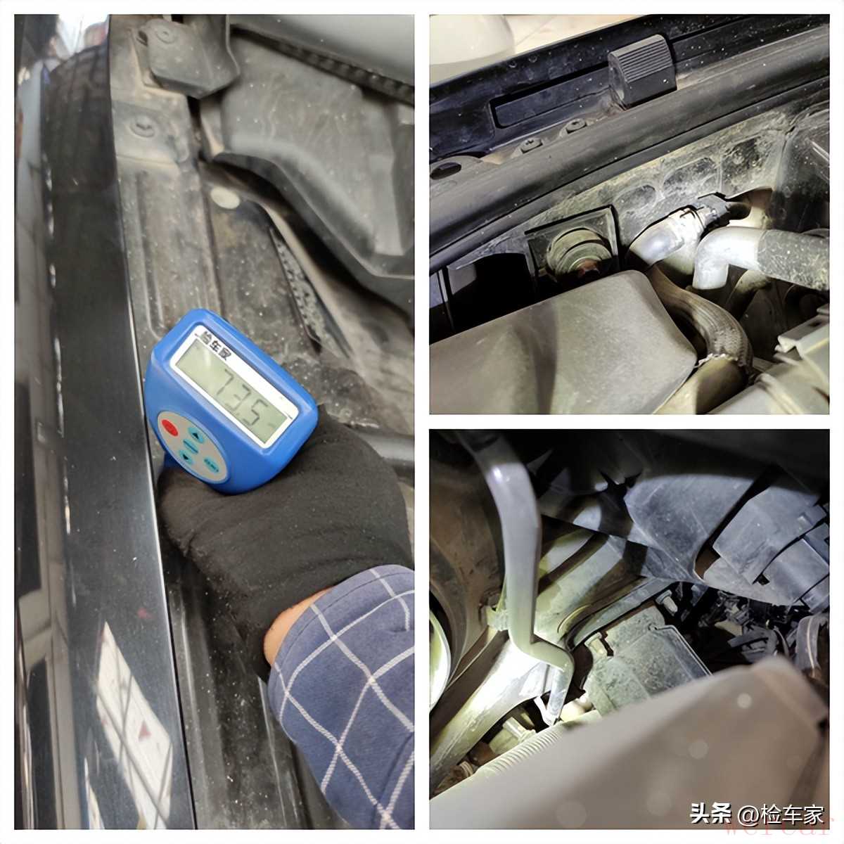减震塔顶打胶均匀,固定螺丝无拆卸拧动痕迹;两侧翼子板梁无变形钣金,漆膜厚度无异常;两前纵梁看着也没啥问题,等会还得上架进一步排查。