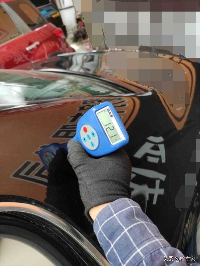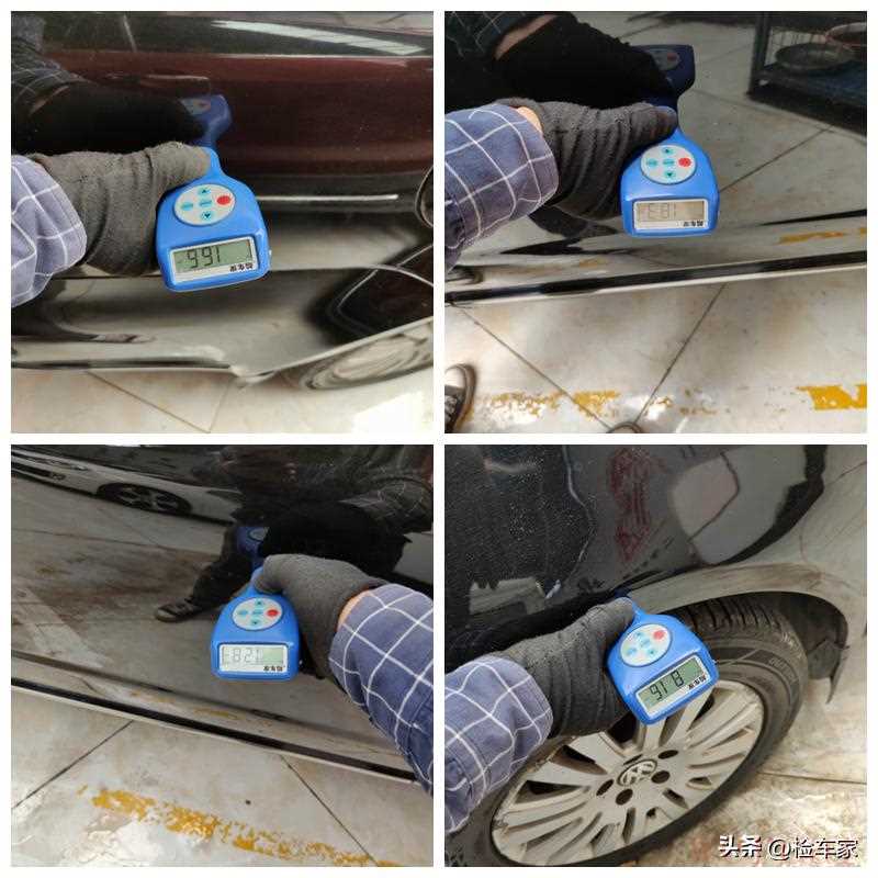 天宝手上这个仪器叫做漆膜仪,它可以测量车漆的厚度,根据厚度高低来判断有没有喷漆或者钣金刮腻子!大众的原车标准一般是在110μm—130μm区间,所以左C柱这里还是原车漆,看看其它位置!