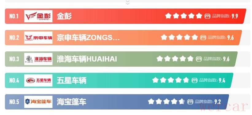 小行家总结:以上就是代步电动三轮车的榜单前5名的排名,从第1到第5名依次为:金彭、宗申、淮海、五星车辆、海宝,这些品牌都是具有较高品牌力,较高市占率,已经拥有不错的用户口碑的品牌,而且,这些品牌都是具备生产资质的资格,选择它们不用为资质不全、质量差没有售后服务而苦恼。