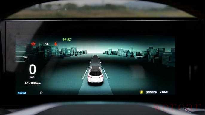 仪表的UI界面很生动,中间部分主要是车辆与辅助驾驶功能等的显示,而因为该系统可以实现自由跨屏交互,所以中控界面还能提供导航等信息。