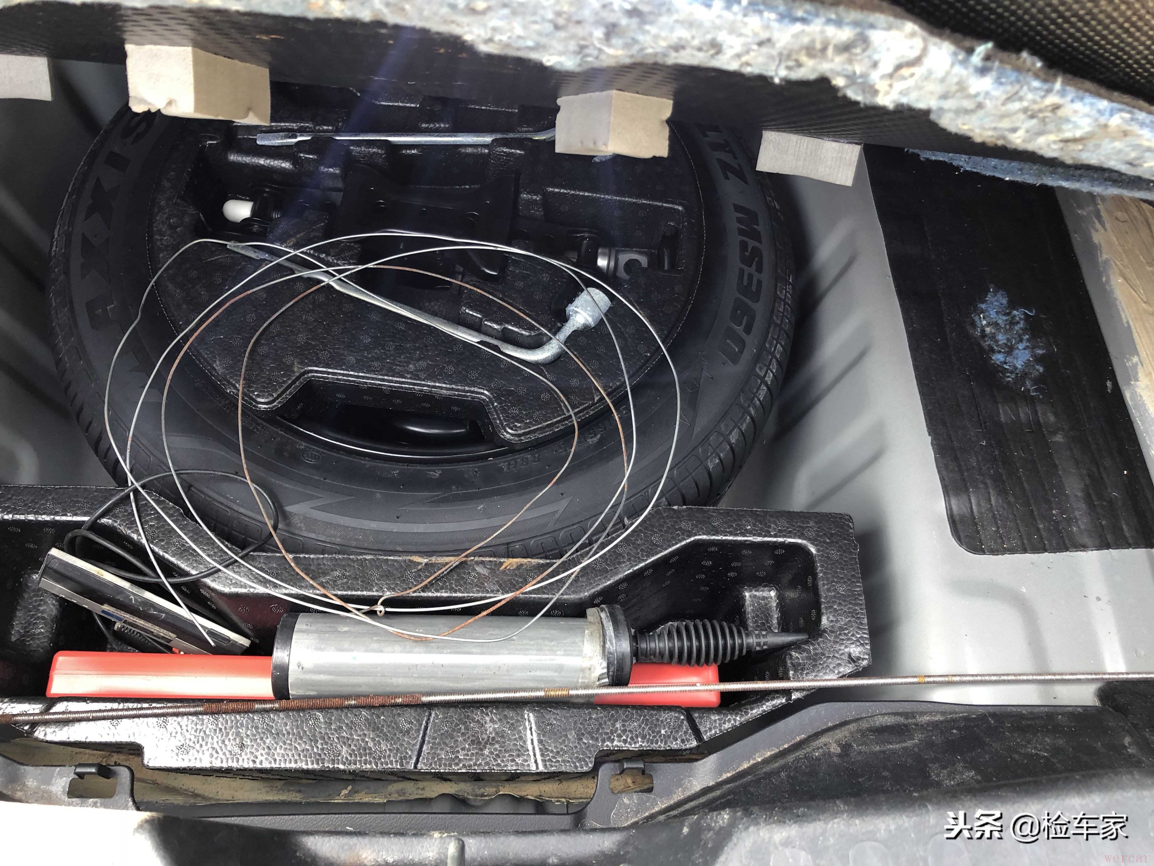 来到车身后打开后备箱,随车工具并未发现缺失;地胶以及备胎槽底部均无水渍,泥沙,以及生锈痕迹。