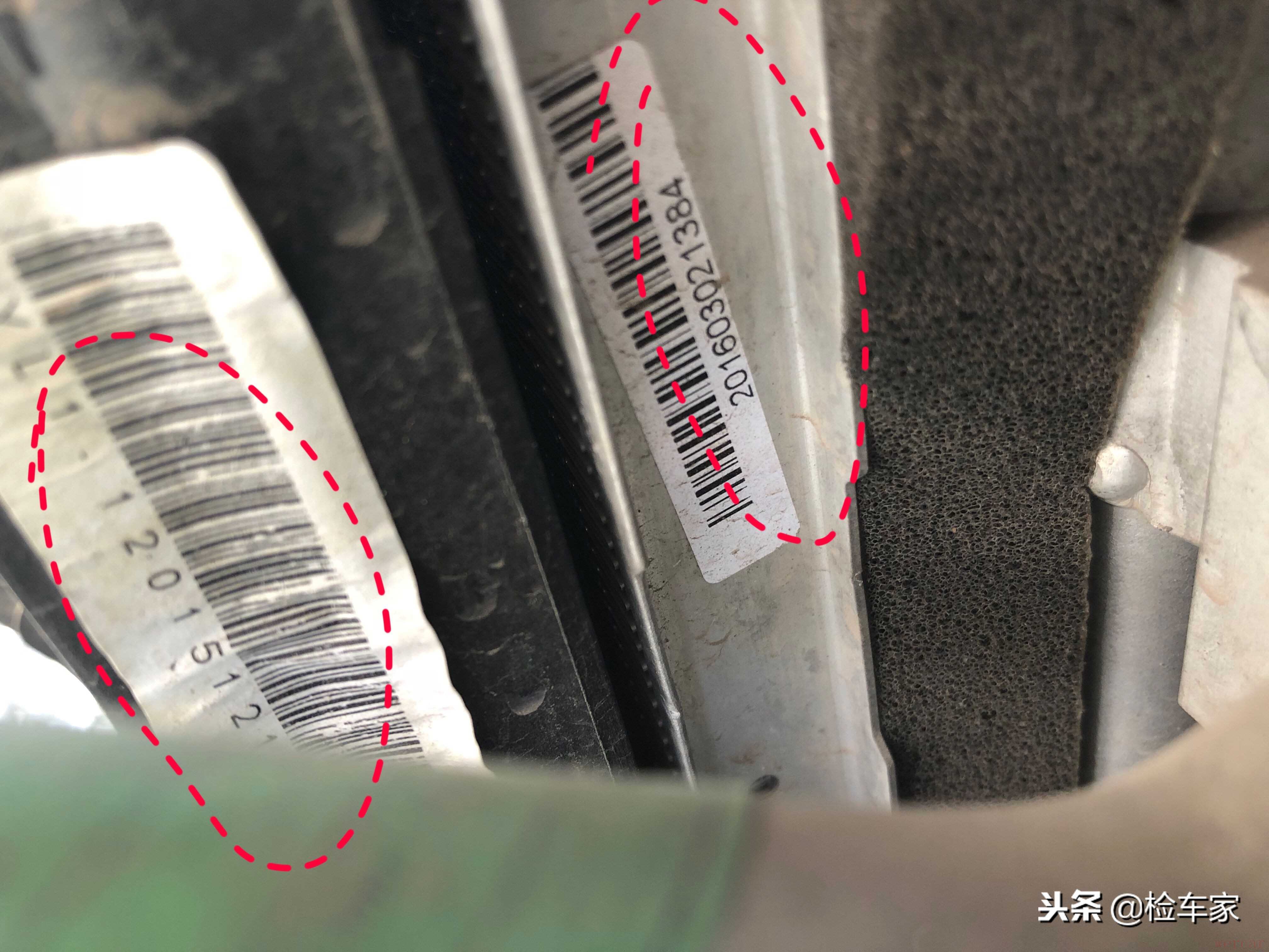 在前中网缝隙中找到了水箱里冷凝器的生产日期,日期与原车日期相符,且水箱框架及附件螺丝无拆卸拧动痕迹,基本保持了车辆出厂时的状态。下一步,我们检查内饰。
