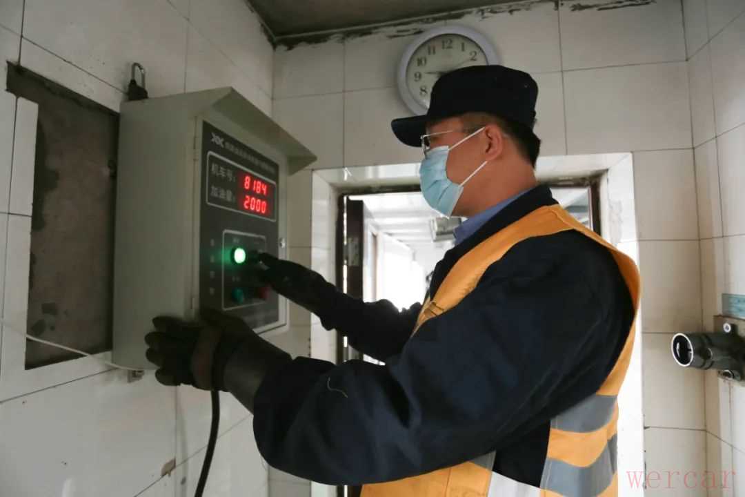 “9道,和谐8184机车,加油量2000升。”整备场上油房里,宋洋正在大声核对着加油机显示屏上的数据,确认无误后迅速开启阀门按下启动键,为机车加注燃油。此时,他的左手食指轻压在加油机红色“急停”按钮上,目光在显示屏和油箱口间来回巡视,大约5分钟后加油作业结束,他立即关闭加油阀门,快速来到机车油箱口,抽出油枪、拧紧油箱盖,所有动作一气呵成。