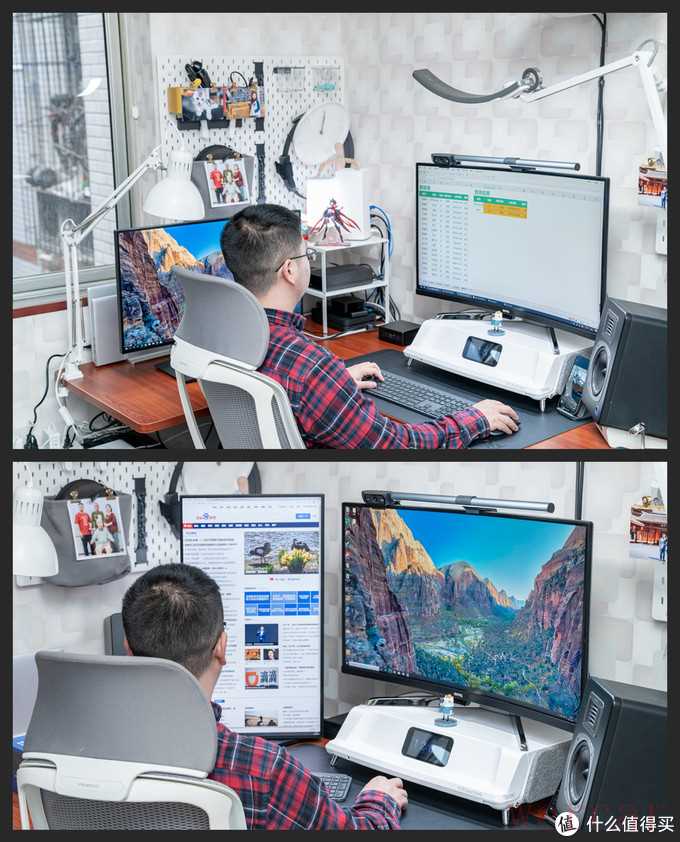 如果在办公室这种小工位上施展不开,也可以把 intel 猎豹峡谷 NUC 拿到家桌面使用,比如我的两个显示器,既可以同时横屏,便于处理不同的类型的工作。也可以一横一竖,竖屏用于浏览文件网页,横屏则处理文档PPT,这么小的主机也能够实现多个显示器共同工作,让人效率倍增。