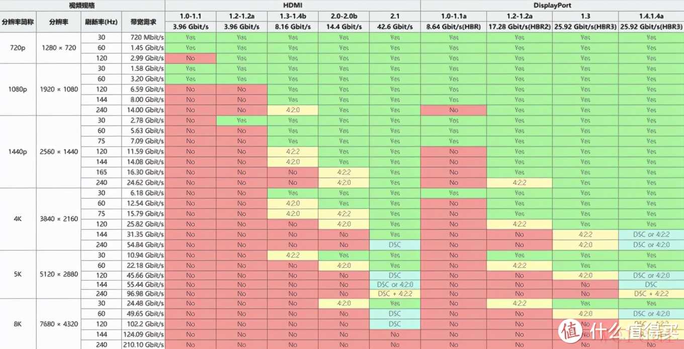 - 【MiniDP 1.4】具有 25.92Gbps 的带宽,可以满足最高 8K@30Hz、5K@60Hz、4K@120Hz 的转接需求,如果是 4:2:0 的色度取样,还可以实现 8K@144Hz、5K@240Hz、4K@240Hz 的视频输出能力。