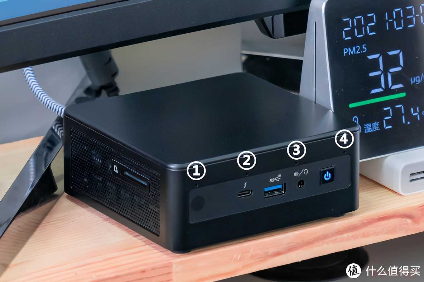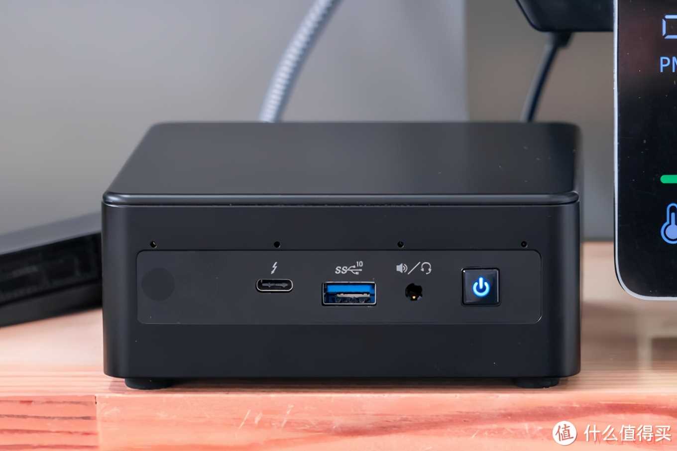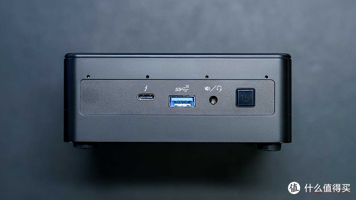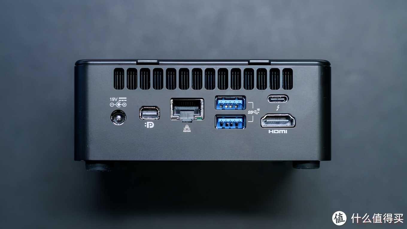 除了体积控制优异外,我觉得 intel 猎豹峡谷 NUC 第二大的亮点在五脏俱全。它的 I / O 接口之丰富,甚至连很多大型主机都自愧弗如。NUC 的正面是一个雷电 3 接口、前置 USB 3.2 Gen 2(TYPE-A)、3.5mm 耳麦一体接口以及电源开关。