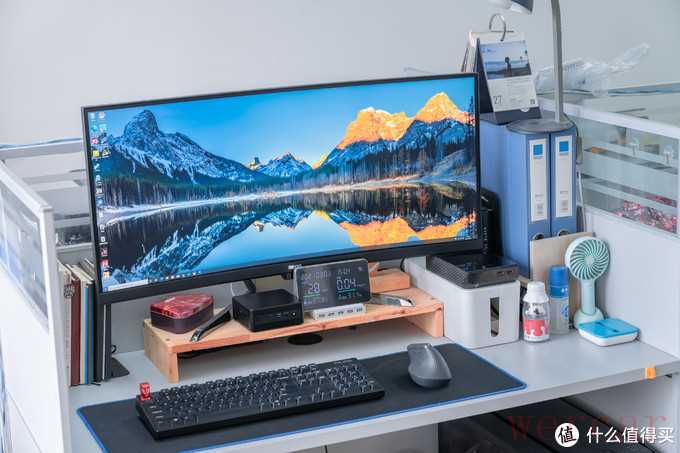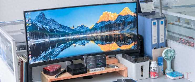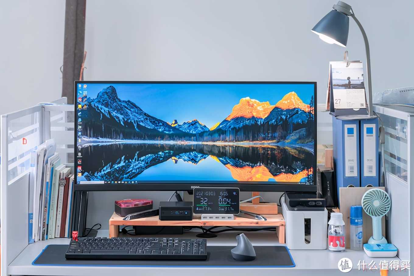 【办公场景】:入手 intel 猎豹峡谷 NUC 用户的首要需求肯定是办公的,我自然也不会例外。在办公室,也能够最大限度的节省空间,因为我之前办公室是有一台放在脚边的 ATX 主机。但是这台的主机硬件和性能过于老旧,而且今年以来一直抽风,所以我就把 intel 猎豹峡谷 NUC 安排到了这里,搭配的是一台明基 EX3501R 的 3.5K@100Hz 带鱼屏显示器。