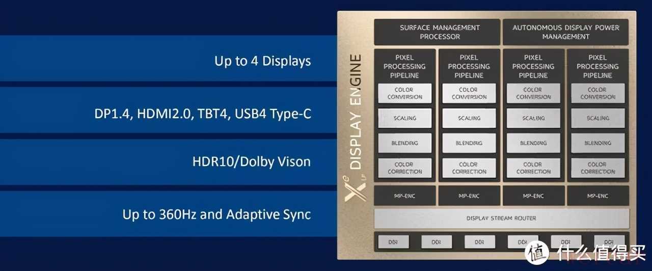 「视频性能」,它可以支持 4 个 4K 和 1 个 8K 显示器输出,此外还原生支持 HDR10、杜比视界、360Hz 刷新率以及 Adaptive Sync 技术。