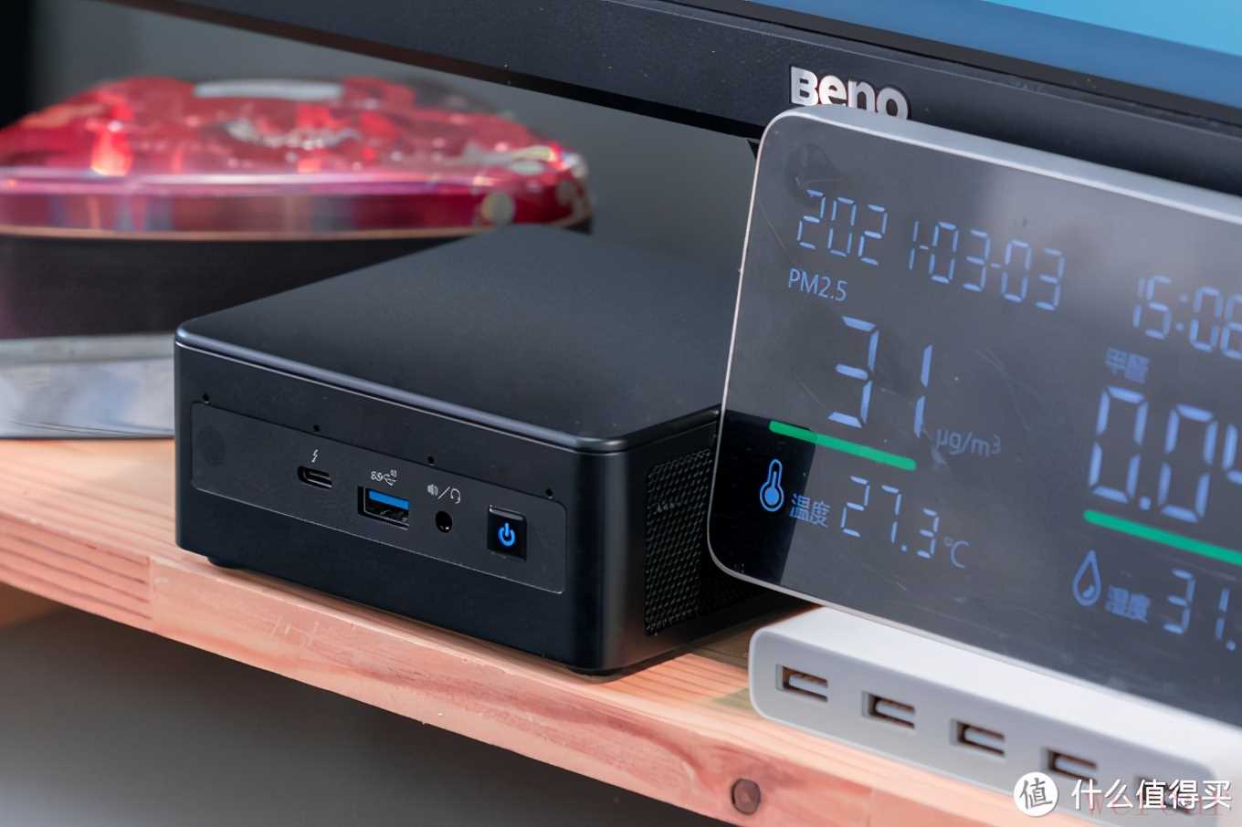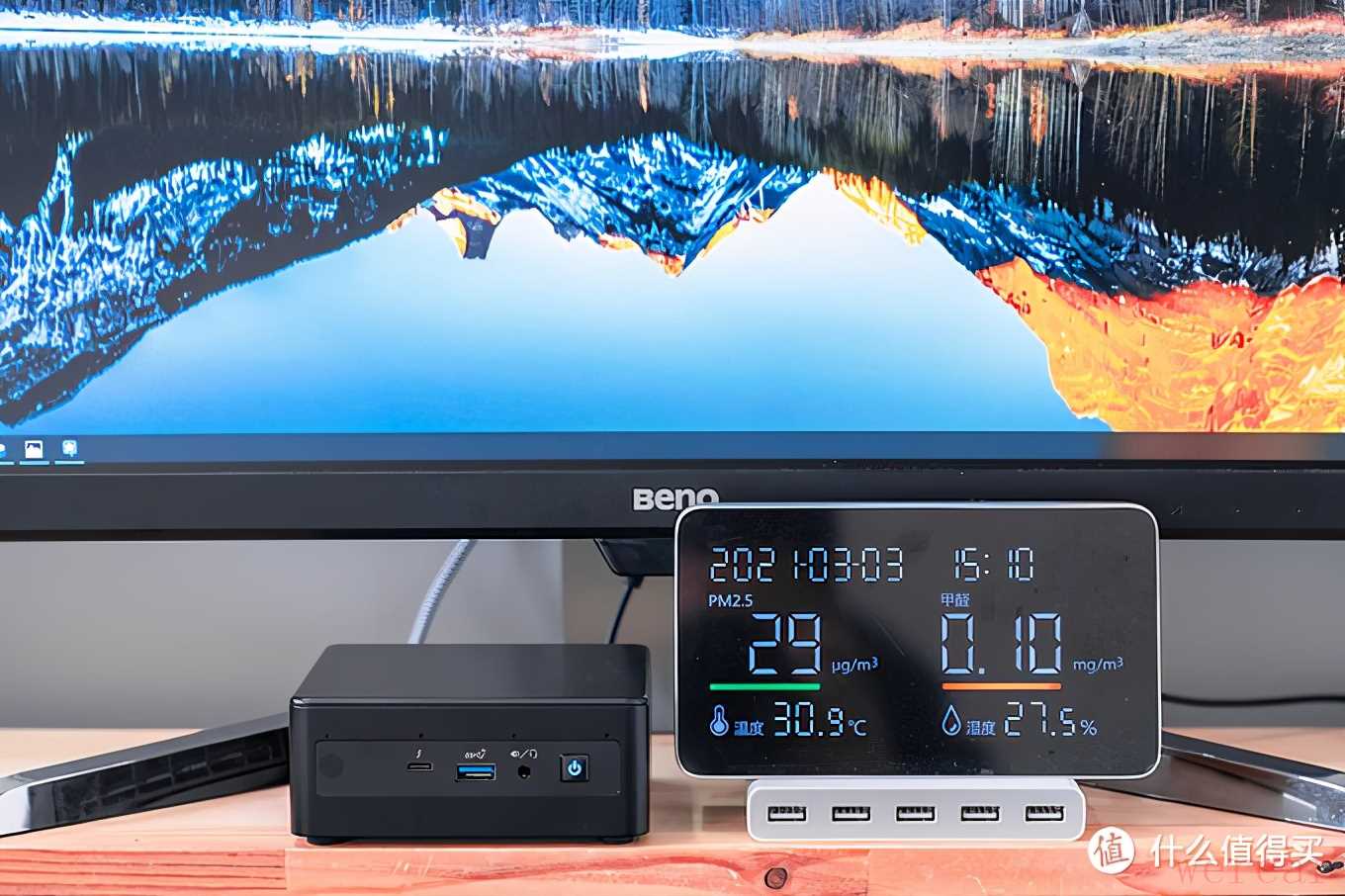从身形上, intel 猎豹峡谷 NUC 比我的某讯空气检测仪还要小上一圈,放在显示器支架中间的区域,真是再合适不过了。
