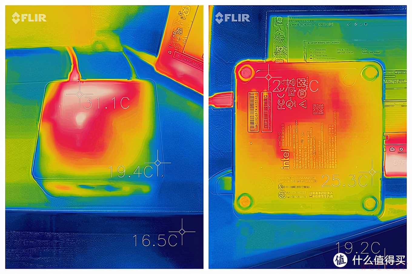 我们通过红外线热成像仪观察,在烤机 30 分钟后, intel 猎豹峡谷 NUC 的外壳热量控制还是比较出色,顶部最高温度仅有 31.1℃。底部的温度相对较低,最高温度 27.3℃,相当的凉爽了。