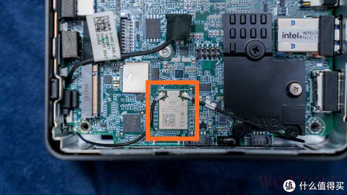 既然有线网络的带宽达到了 2.5Gbps 的标准,那么 intel 猎豹峡谷 NUC 的无线网络自然也不会拖了后腿,所以选配了 intel Wireless-AX 201 无线网卡(橙色区域),支持 Wi-Fi 6 网络,内部集成了蓝牙 5.0。