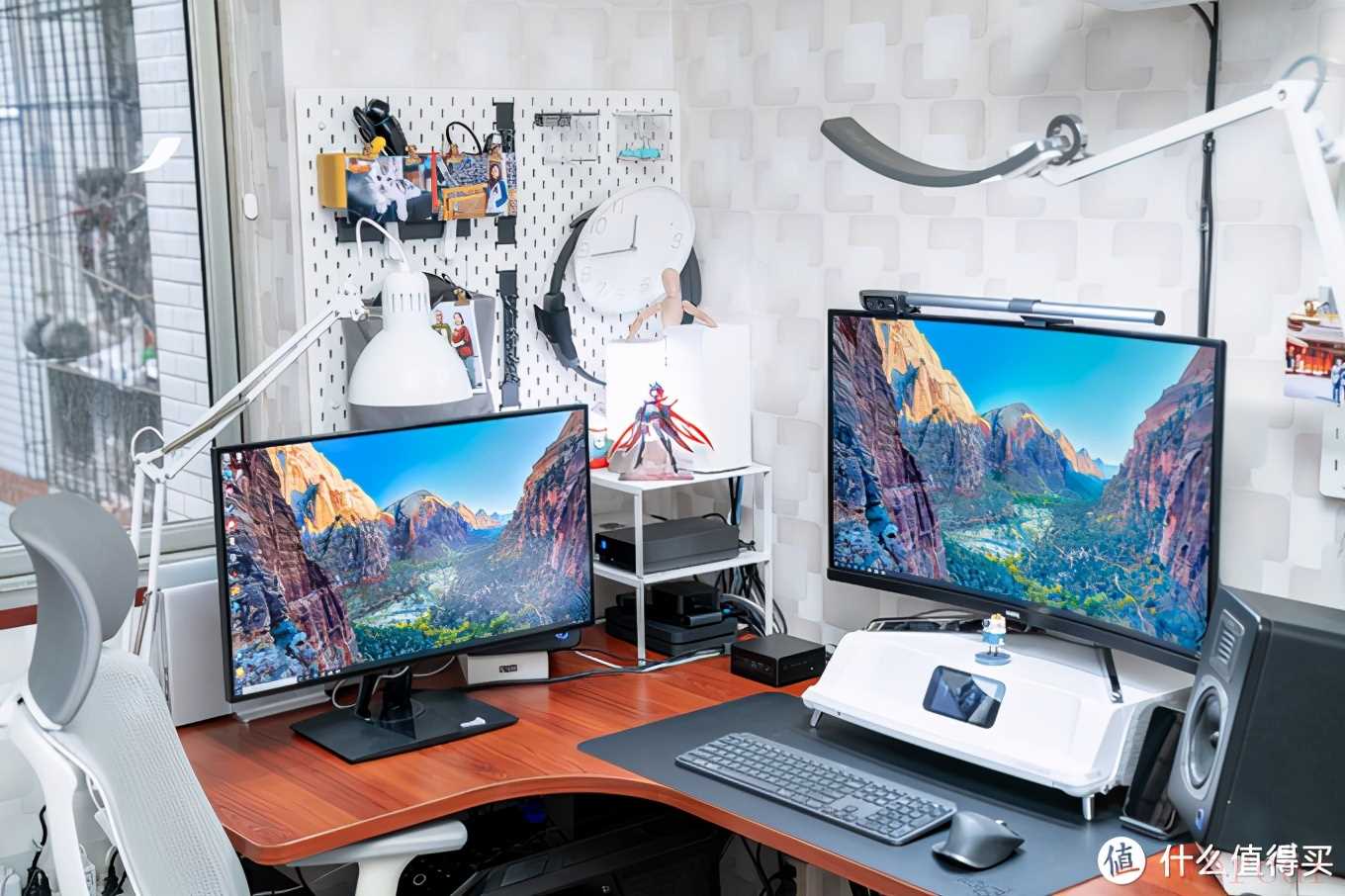 我个人比较推荐的显示器连接有两个方向:一个是走雷电 3 菊花链的方向,intel 猎豹峡谷 NUC 通过雷电 3 扩展坞实现多屏幕的转接,比如我家这种方案,好处在于桌面更加简洁,我的桌面是明基 2K@144Hz 和优派 4K@60Hz,自然没有压力。