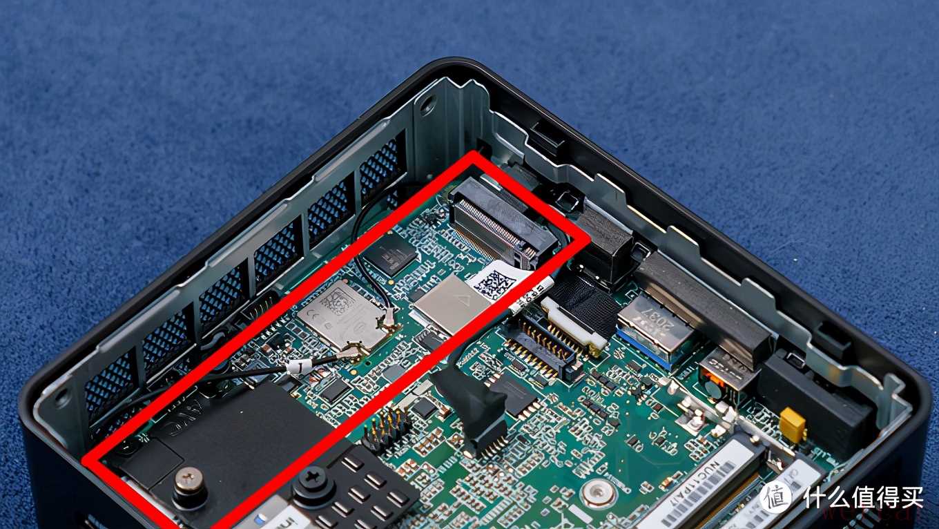 硬盘接口方面,底盖上拥有 SATA 3.0 接口(前文黄色区域),可以安装一个 7mm 的笔记本机械硬盘或者 2.5 英寸的固态硬盘。NUC 内部还有一个 M.2 22×80 接口(红色区域),支持 PCIe 4.0 NVMe 协议,最为合适的就是PCIe 4.0 NVMe 固态硬盘。