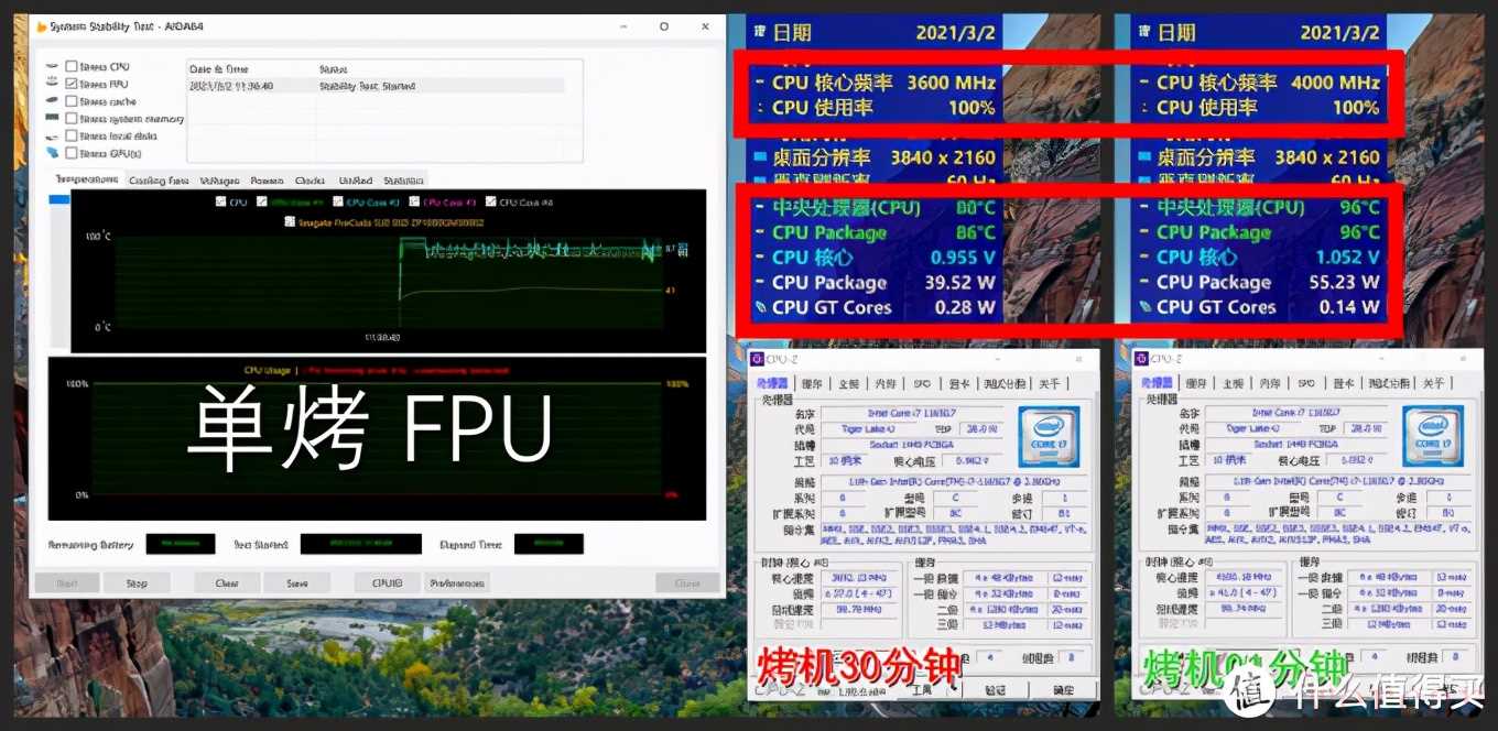 【功耗发热】,那我们就把压力测试安排上,使用的是 AIDA64 的单烤 FPU 测试,烤机 30 分钟后可以看到有一定的降频,但幅度较小,并且温度也有所下降。