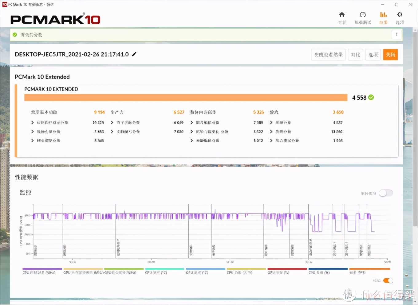 【整机性能】方面,我们使用 PCMark 10 Extend 测试整机性能,可以看到这台 intel 猎豹峡谷 NUC的常用基本功能得分 9194 分,生产力得分 6527 分,数位内容创作 5326 分,游戏得分 3650 分,总体得分表现相对不错,算得上一枚“办公小钢炮”了。
