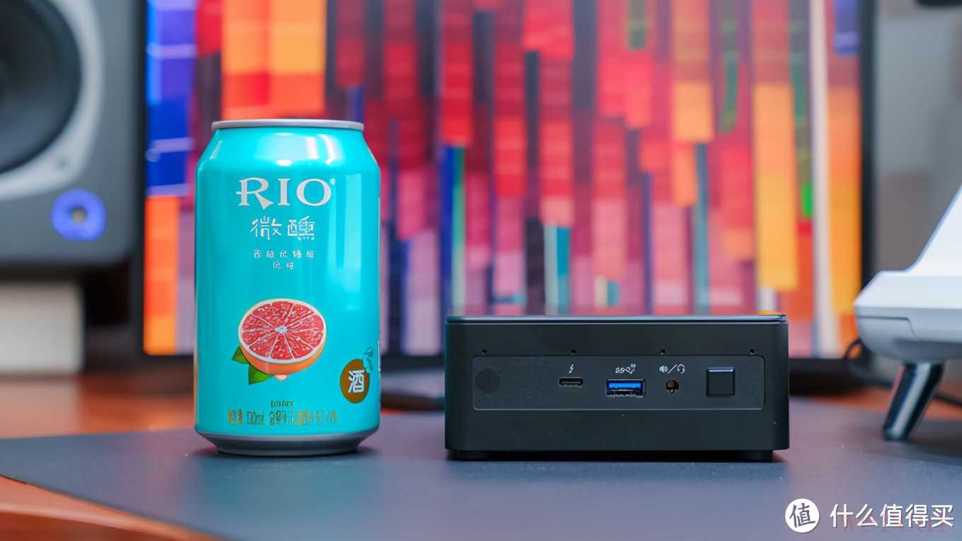 从包装中拿出来的 intel 猎豹峡谷相当小巧,它的三围控制在了 117mm(长) × 112mm(宽) × 51mm(高)。按照长方体体积公式加以计算,体积仅有 0.668304 dm³ ≈ 0.66L,也就差不多 2 瓶易拉罐的容积。