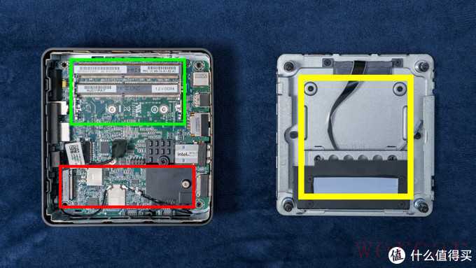 【内部拆解 & 硬件安装】:接下来,我们拆了它。相比于传统从侧面和顶部开盖的机箱,intel 猎豹峡谷 NUC 选择的是底部开盖,拧下四颗嵌在垫脚的螺丝即可拆开,轻巧便捷。这个底盖还预留了 SATA 3.0 接口用于硬盘连接(黄色区域),同时还有一个预留的固态散热硅胶片,考虑周到。
