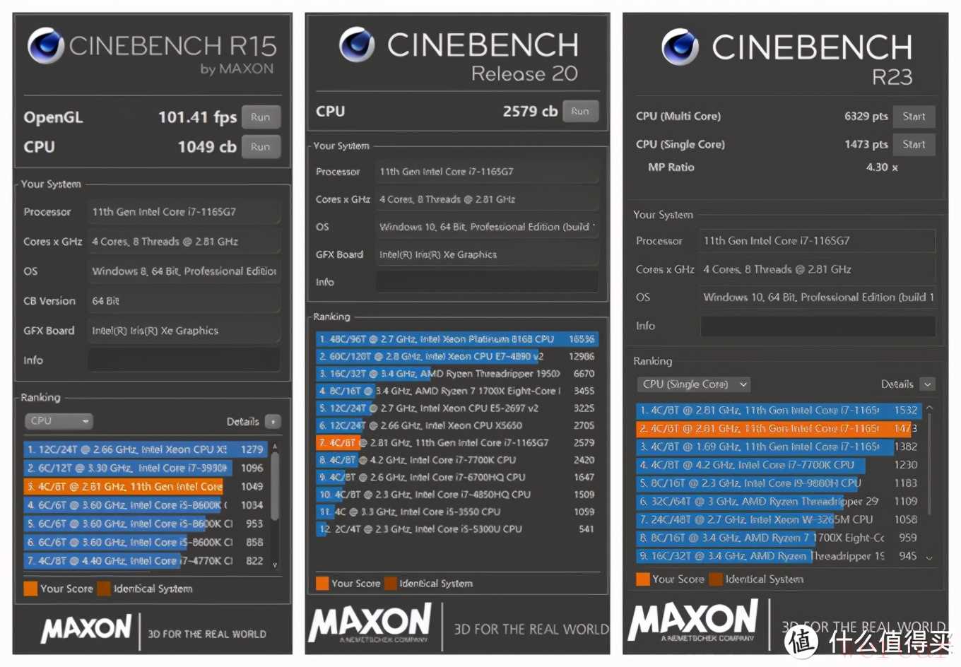 CPU-Z 的性能测试,单核测试得分 603.8 分,多核性能 2742.4 分;国际象棋测试,对比倍数 36.22,每秒千步 17386;GeekBench 测试单核性能得分 1583 分,多核性能 5434 分。CINEBENCH R15、R20、R3 的测试结果如下,总体来说,i7-1165G7 这款处理器的单核性能是较为强劲的,甚至好于上一代 intel 标压处理器,在处理单一任务时更占优势。