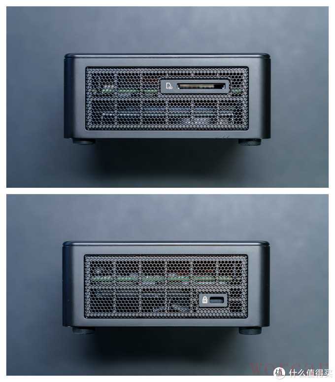 intel 猎豹峡谷 NUC 的两个侧面则是大面积的散热栅栏开孔,同时还加入了一个 SDXC 卡槽(支持 UHS-II)和防盗锁孔设计。这位小兄弟实在是太便携了,我第一次觉得电脑主机真有锁上的需求了,感觉谁都能揣大衣包里直接顺走。