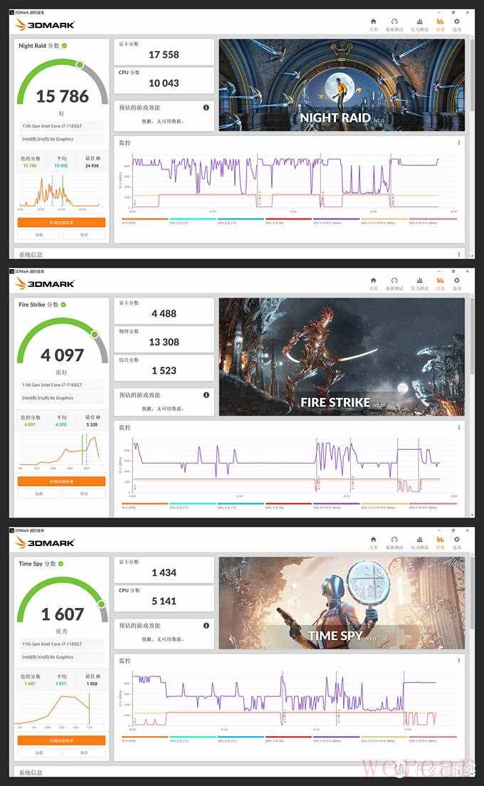 下面是 3DMark 的 Night Raid、Fire Strike(DX11) 以及 Time Spy(DX12) 三个场景的图形性能测试,得分情况好于许多入门级的独立显卡,诸如 MX 系列,所以完全足够满足商务办公甚至主流 3A 游戏的性能需求。
