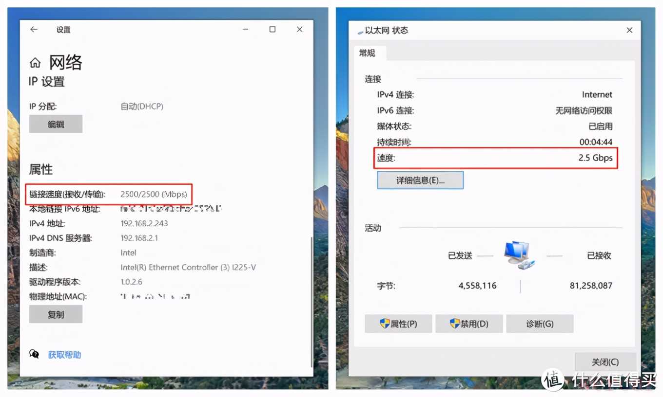 除了外接屏幕输出能力的出色外,intel 猎豹峡谷 NUC 所拥有的 2.5Gbps RJ45 以太网端口和 Wi-Fi 6 对于我家这种拥有万兆局域网环境的用户也相当的友好。可以看到我的 intel 猎豹峡谷 NUC 连接到威联通的 QSW-M408-4C 万兆交换机,带宽直接拉满达到 2.5Gbps,理论读写的速度就可以达到 312.5MB/s。