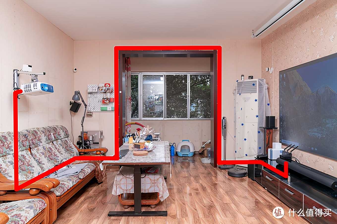 因为我家使用 4K 中长焦投影仪在沙发后,幕布和电视柜在前面,也没有在墙体中预铺 HDMI,所以只能从墙边缘飞线,我算了一下差不多要 14 米左右的长度(下图红色走线),刚开始的解决方案是用 3 根 5 米的 HDMI 2.0 线缆相连,使用 HDMI 2.0 母对母信号对接延长器相连,结果发现 2 根 HDMI 显示正常,而 3 根直接就绿屏无法观看了,而且传统的 HDMI 线缆在长距离的传输下,视频输出能力会有所下降。