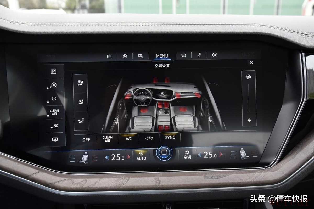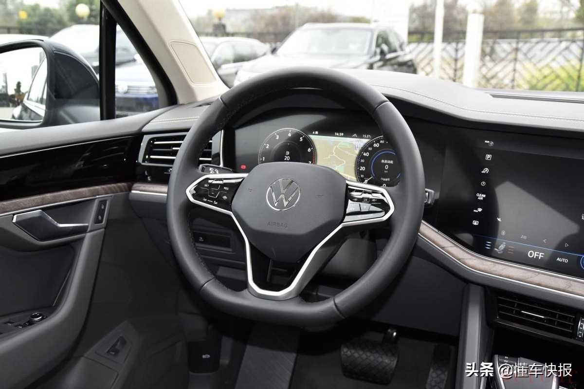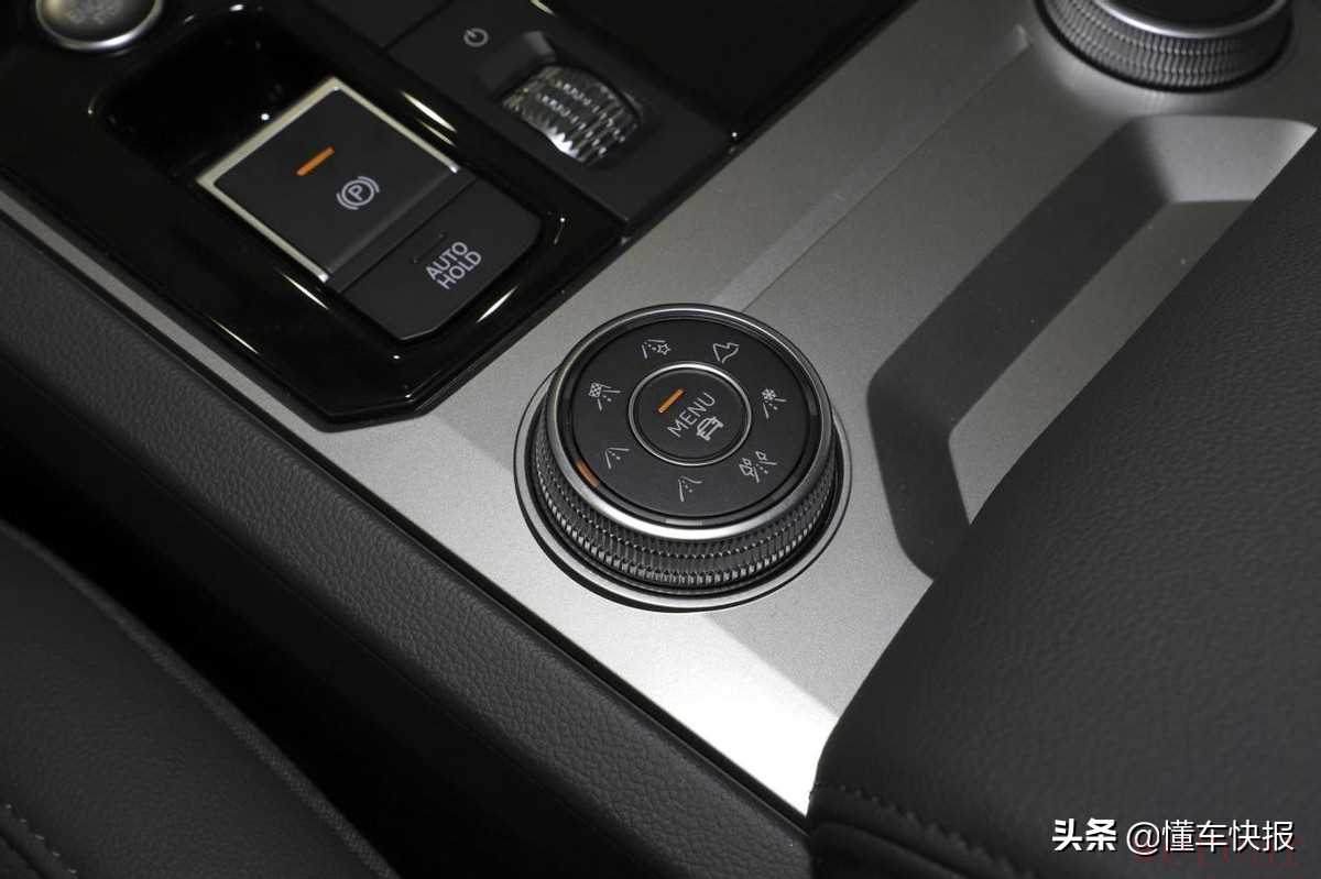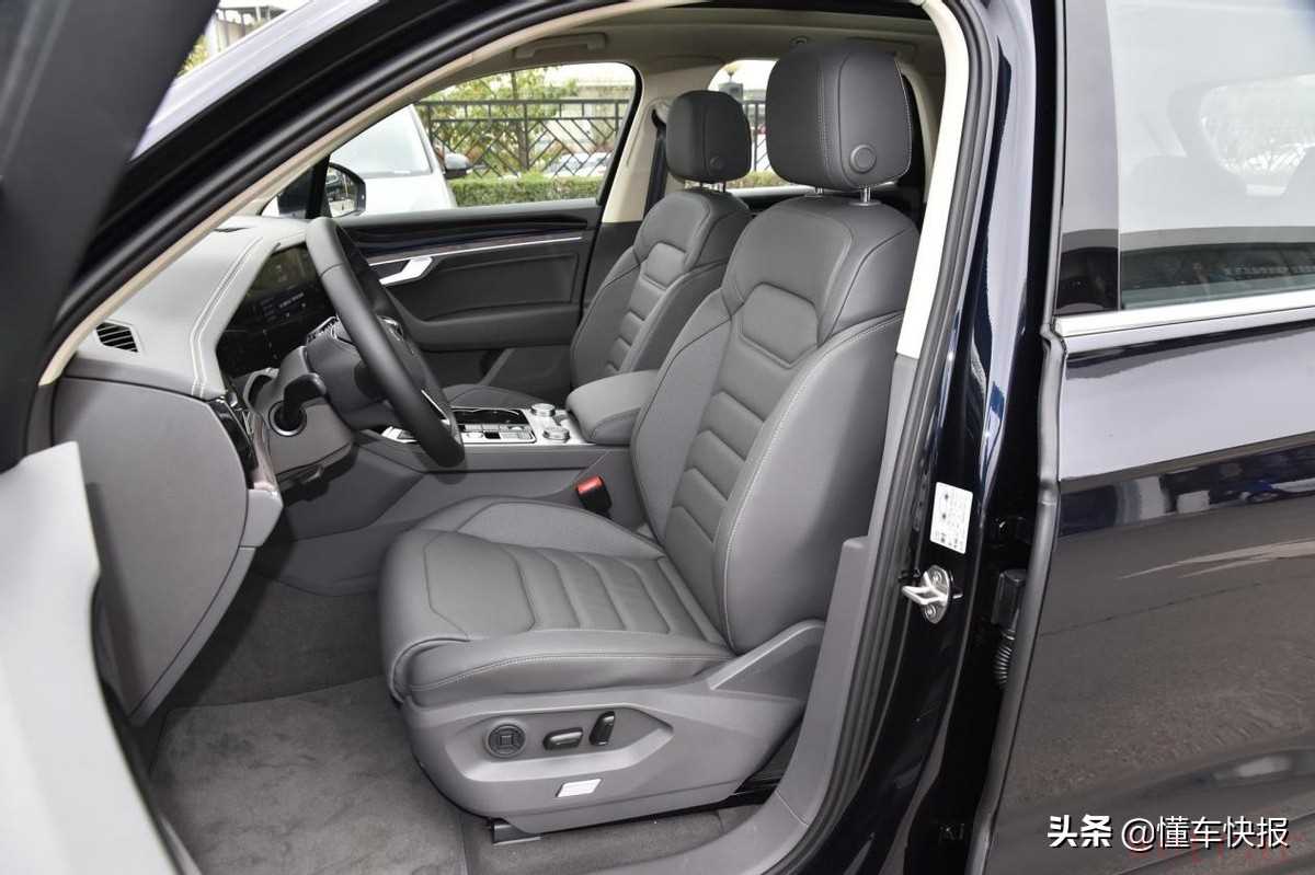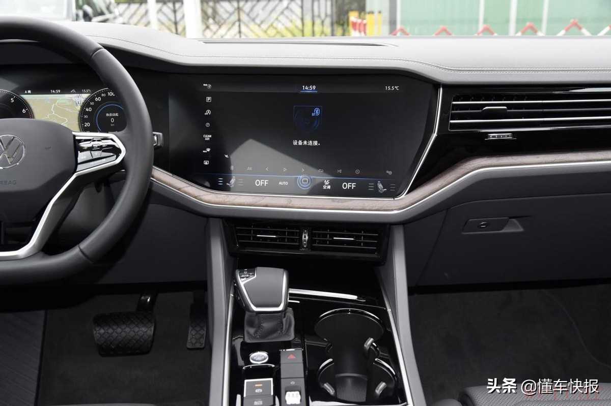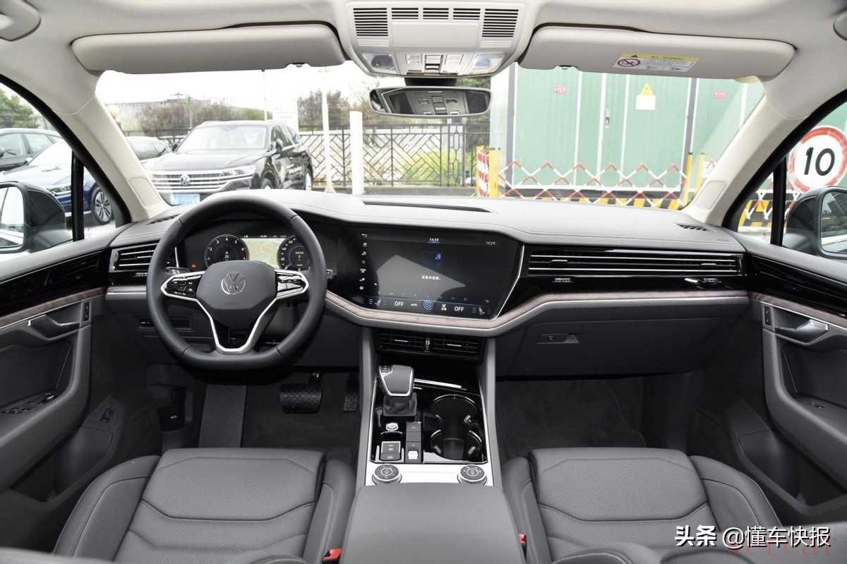 内饰的用料体现出了大众汽车品牌旗舰SUV的水平,大面积的真皮材质覆盖,加以缝线点缀,配合木纹及金属装饰板,内饰质感很强,另外还有30色氛围灯,烘托豪华氛围。