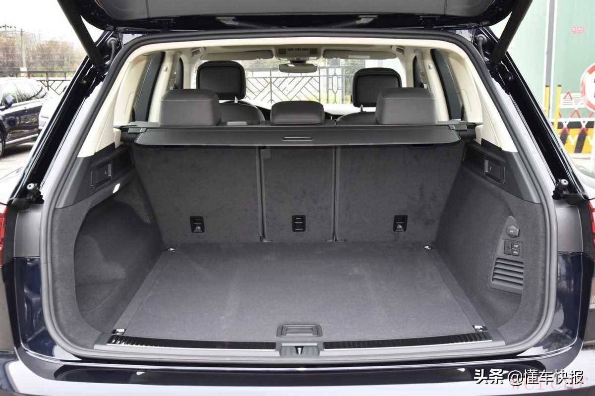 途锐的后备厢常规容积达到810升,第二排座椅靠背还能按比例放倒,进一步扩大后备厢容积。后备厢还带有挂钩、挡板以及12伏电源接口,实用性很高,另外,还设置了空气悬架调节按键,如果搬运大件物品可以降低后备厢高度。除此之外,途锐的电动后备厢带有感应开启和高度记忆功能。