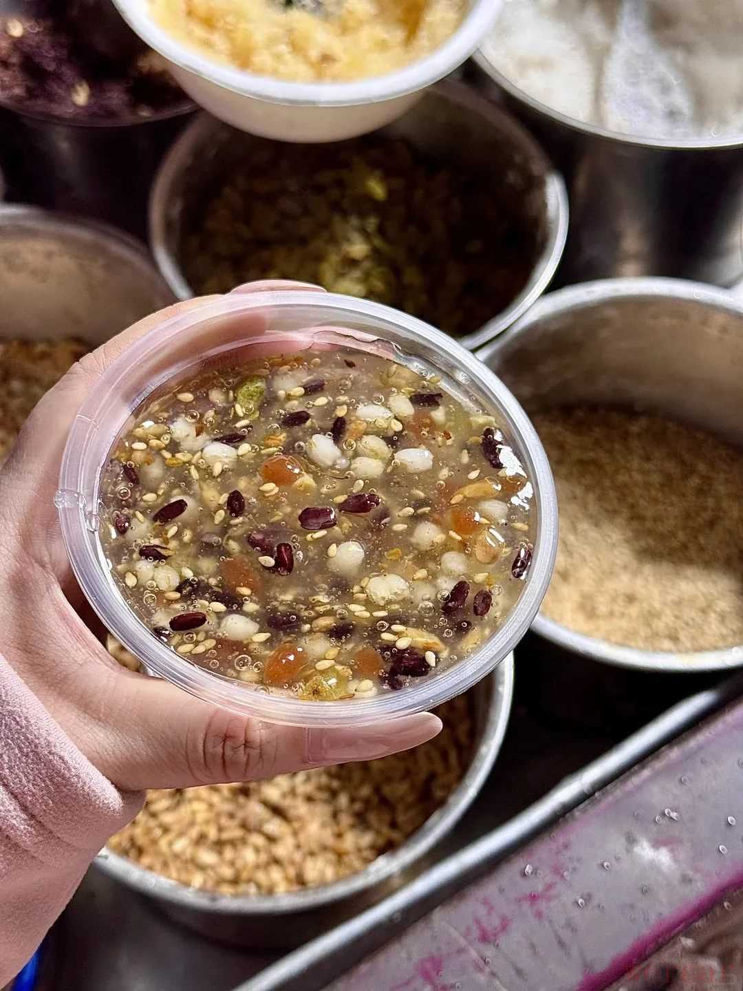想吃“豪华版”藕粉,就尝尝藕粉粥。以黏稠的藕粉为底,加入葡萄干、枸杞薏米、黑芝麻、花生等小料,最终得到一碗如同八宝粥一般丰富的藕粉粥。