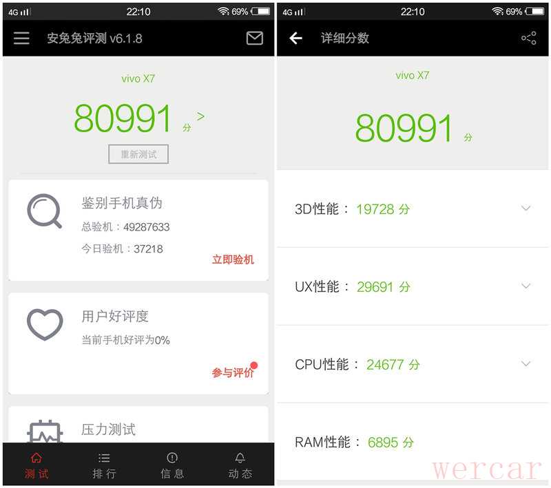 vivo X7的安兔兔跑分评测结果为「80991分」,成绩在同定位机型中能达到中上水准,综合性能表现还算不错。随后,笔者通过《王者荣耀》进行30分钟游戏实测,测试后机身会略显发热(盲测约为30~33度左右),仍在可接受范围内,所以在发热方面我们也无需过分担心发热方面的问题。而游戏运行总体较流畅,不过在人数较多和高特效场景切换时偶尔会出现非常轻微的掉帧,但手机很快就会矫正过来流畅运作。