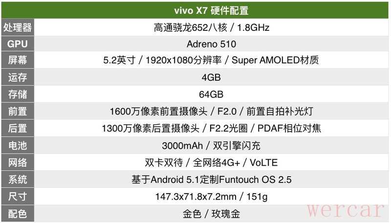 首先我们先来看看vivo X7的硬件配置,该机采用一块5.2英寸1920x1080分辨率的Super AMOLED显示屏,内部采用高通骁龙652八核64位处理器,提供最高1.8GHz主频功率,辅以4GB运存+64GB机身存储空间。摄像头采用前置1600万像素柔光自拍摄像头+1300万像素后置摄像头,支持PDAF相位对焦、智能美颜、运动防抖等相机技术。此外,该机配置一块3000mAh电池,支持vivo独家双引擎闪充技术、双卡双待全网通4G+/VoLTE网络制式以及后置极速指纹识别功能。