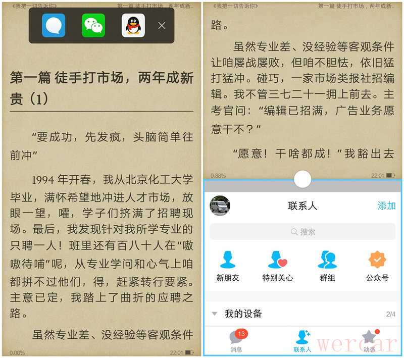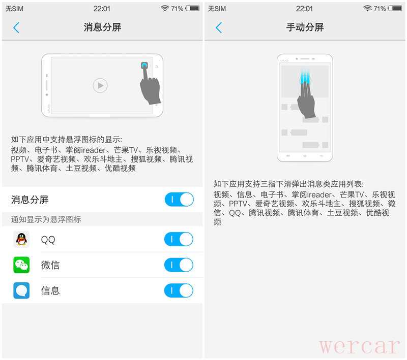 手动分屏功能支持打开短信、微信及QQ程序进行分屏