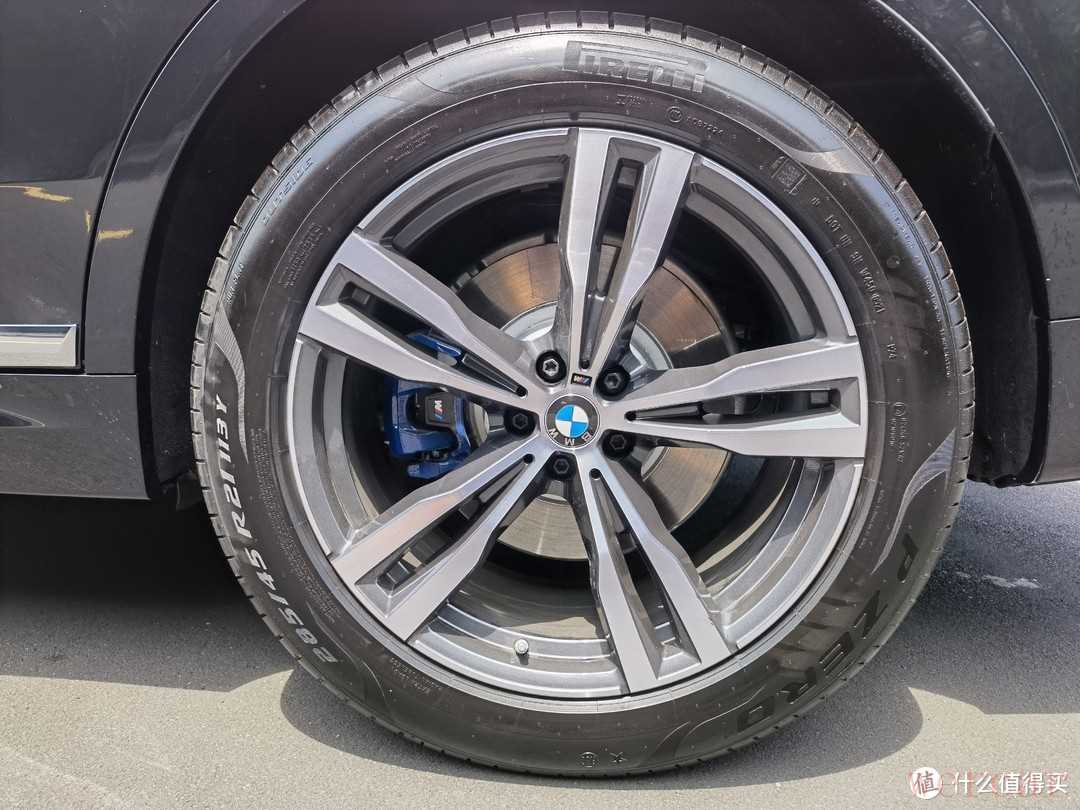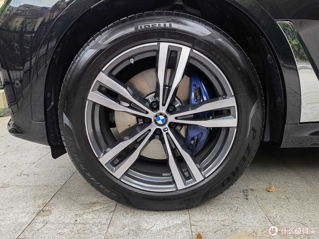 对于x7来说21寸轮毂不算大,还是应该22-23寸比较合适。285/45/R21,以后换胎不便宜。Brembo代工蓝色M卡钳。
