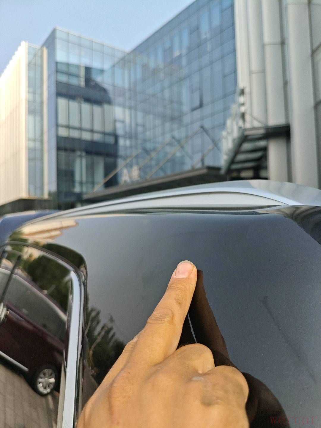 不过,在我仔细检查右前A柱的时候,发现了好几个小坑,再看前方压条,果然也有坑,但整体漆面数值又很正常,推测应当是冰雹砸出来的。