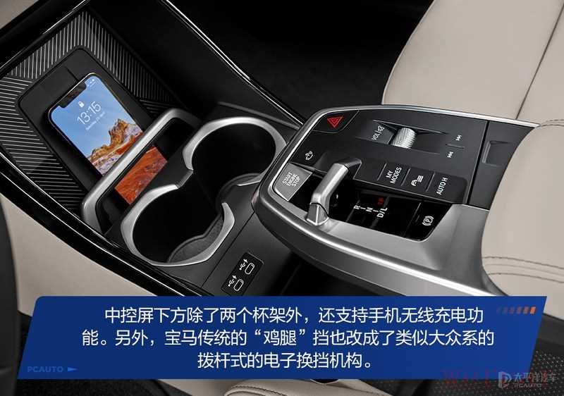 相比外观,新车内饰变化更大,采用了时下非常流行的一体式曲面屏设计,它由10.25英寸全液晶仪表和10.7英寸中控屏组成,并内置了宝马最新的iDrive 8车机系统。同时,在中控屏下方还支持手机无线充电功能,而功能控制区域与中央扶手形成了一个断崖式的设计。另外,宝马传统的“鸡腿”挡也改成了类似大众系的拨杆式的电子换挡机构。