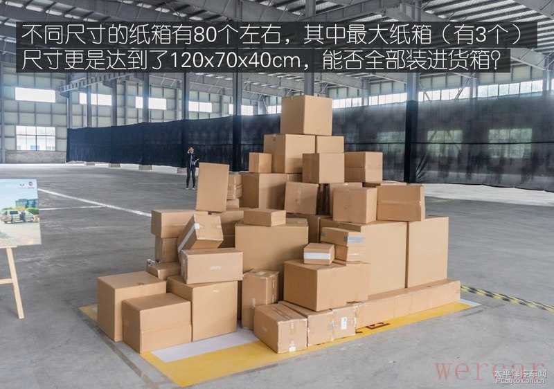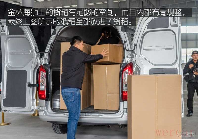 为了测试金杯海狮王的装载能力,活动现场还安排对应的体验项目,工作人员提供了一堆大小各异的纸箱,让我们在保证纸箱不受损的情况下尽情地塞进金杯海狮王的货箱里。据了解,几个较大的纸箱尺寸为120x70x40cm、90x60x60cm、80x50x50cm,还有一些其他尺寸的,最终金杯海狮王总共装载了约80个纸箱。