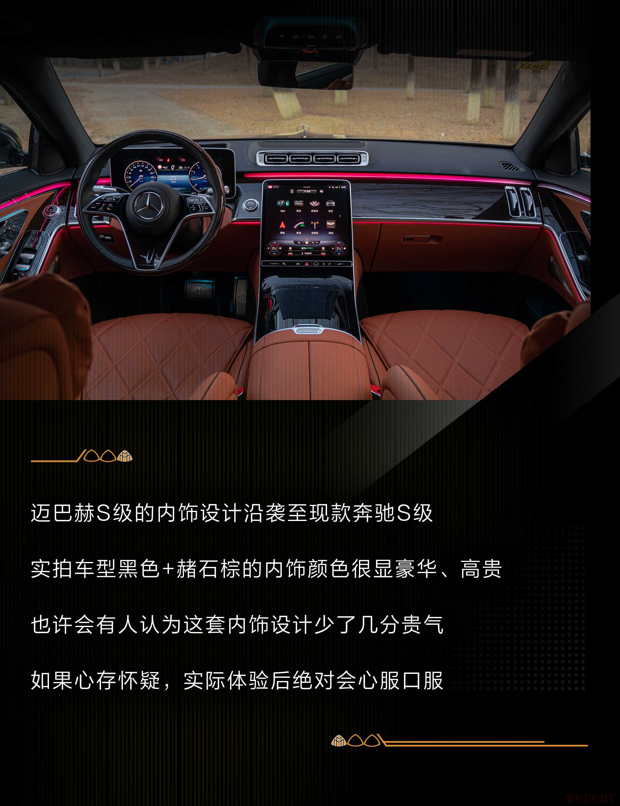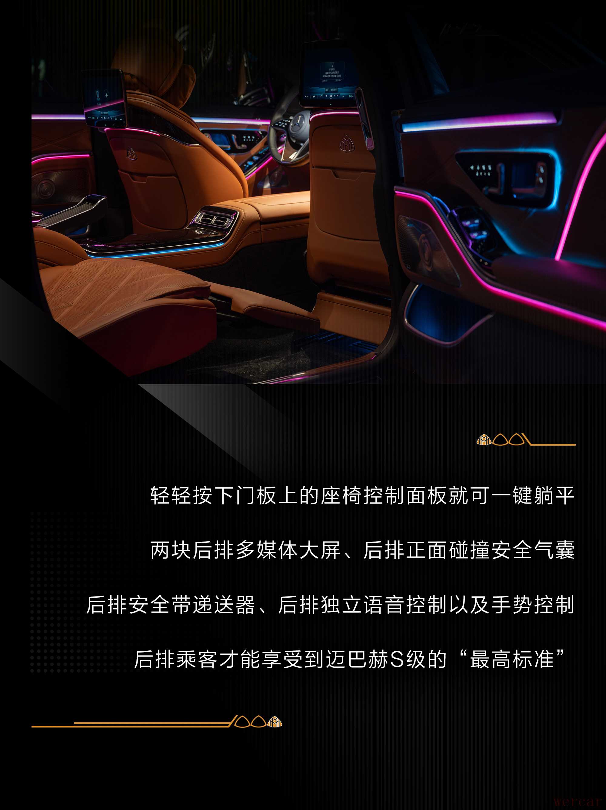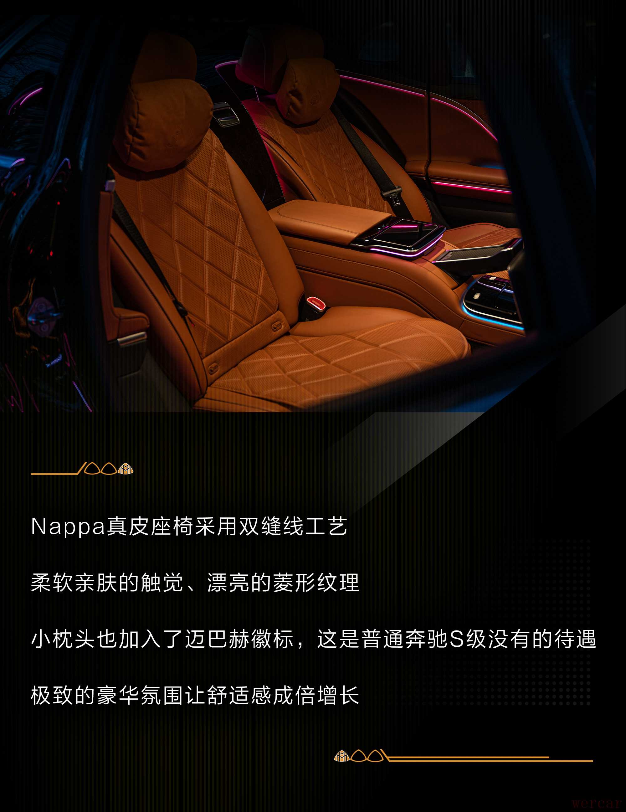 2. "技术传承与创新:" S480继承了梅赛德斯-奔驰的技术核心,包括先进的空气动力学设计(如带有鲨鱼鳍扰流板的设计语言)、豪华内饰用料(如Nappa真皮、实木饰板、金属拉丝等)、先进的驾驶辅助系统和舒适性配置。同时,它也融入了迈巴赫独特的豪华元素,如独特的标识、专属座椅设计、哈曼卡顿音响系统等。