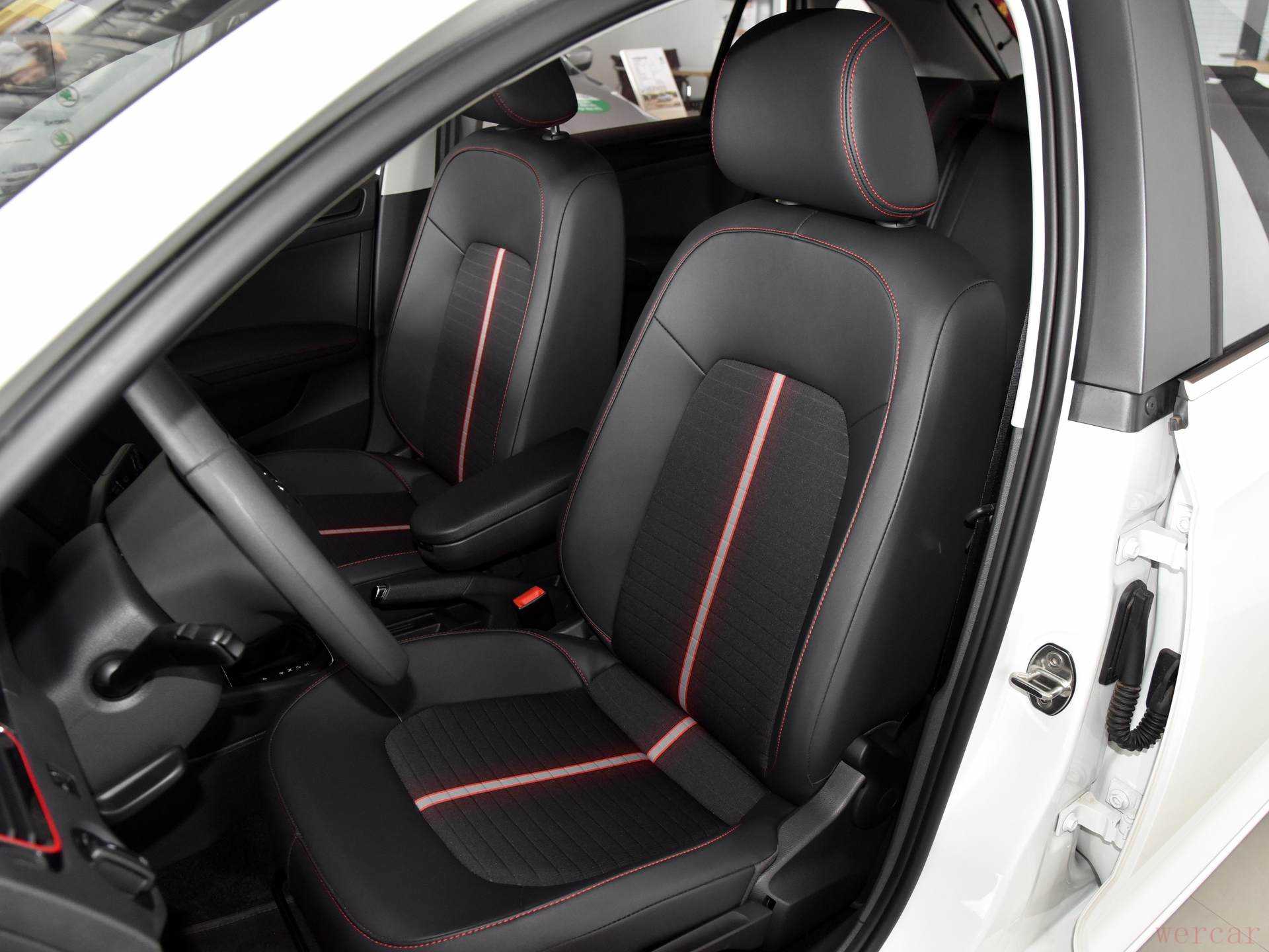座椅使用了皮和织物拼接的材质。既保证了档次感,冬天又不像真皮座椅那样坐起来特别冻人。而且红白色的缝线看起来也很有运动气息。不过座椅的配置并不高,前排座椅均不支持电动调节。