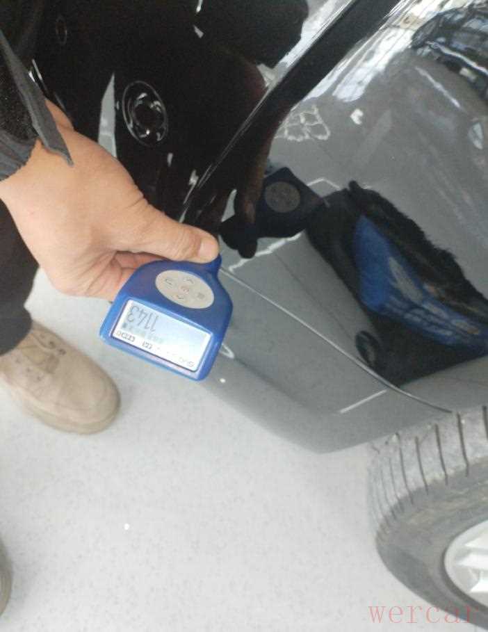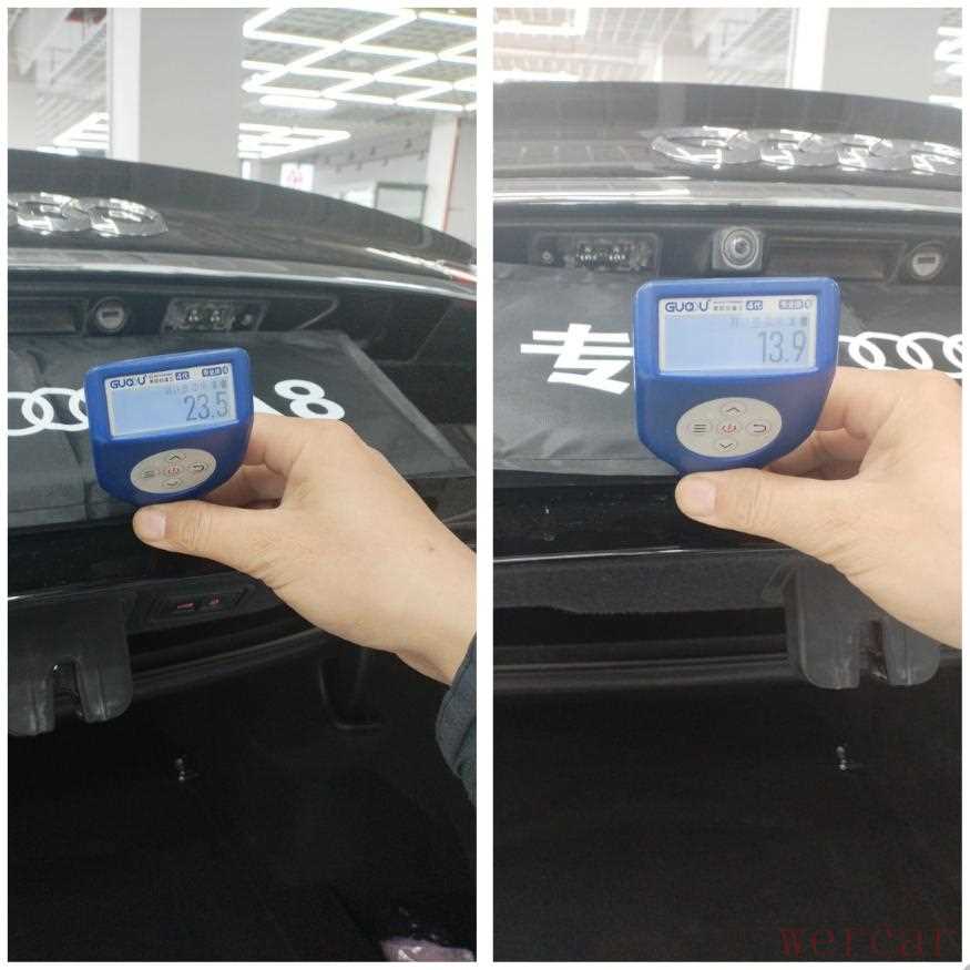 检测到后尾门时,漆面明显低于原车漆面数值,平均才十多二十微米,很明显是有问题的。于是打开尾门查看固定铰链,发现也是拆卸过的,位移也很明显,所以综合判断后尾门是换过的。